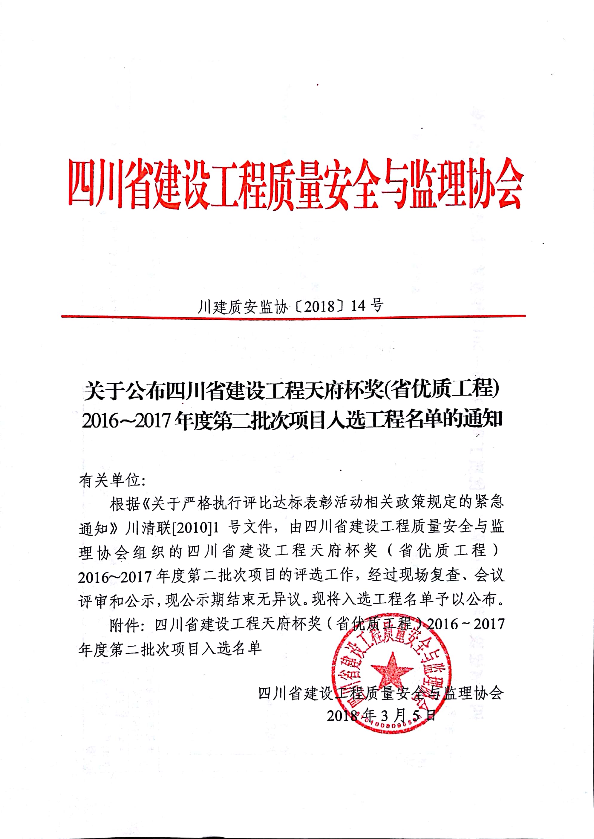 名单附件:四川省建设工程天府杯奖(省优质工程)2016~2017年度第二批次项目入选名单