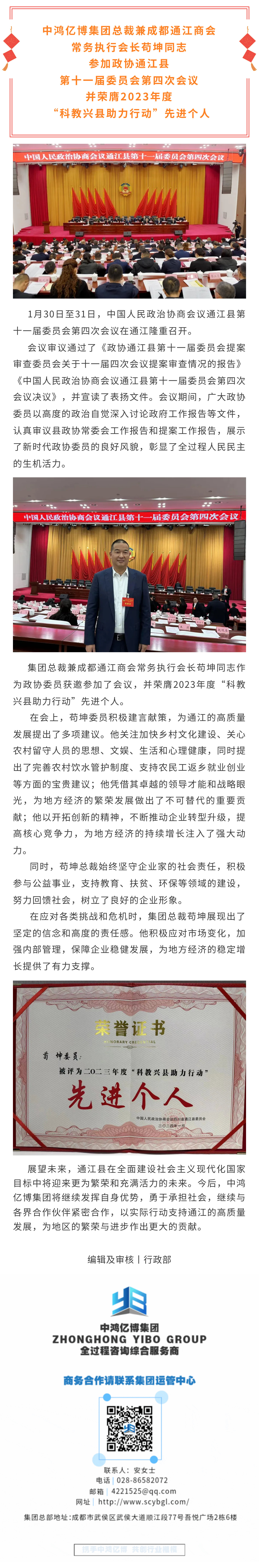 亿博动态丨集团总裁苟坤同志参加政协通江县第十一届委员会第四次会议并荣膺2023年度“科教兴县助力行动”先进个人