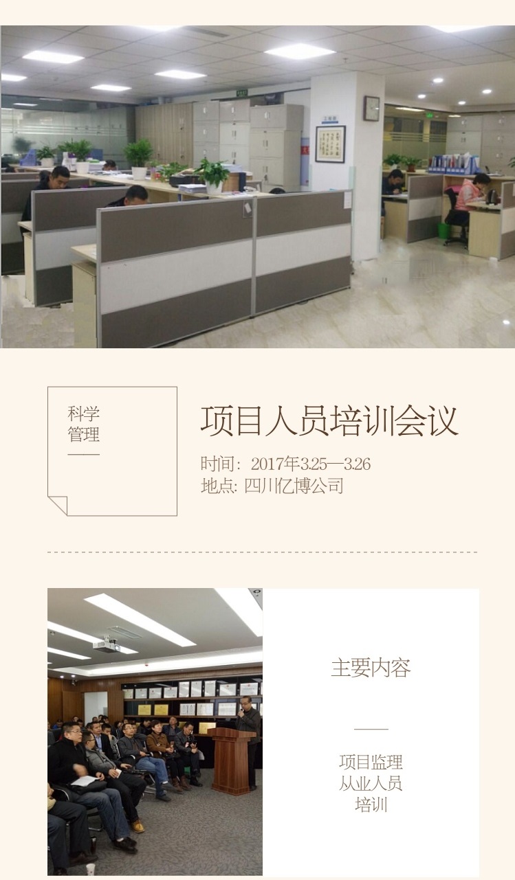 四川亿博工程管理有限公司2017年第一次项目监理从业人员培训会议的召开,无疑为以后公司的管理奠定了工程项目管理科学化、规范化的基础,逐步形成本公司独特的管理体系,进一步提升我公司的整体管理水平和综合实力,使公司的稳步、健康、可持续发展。