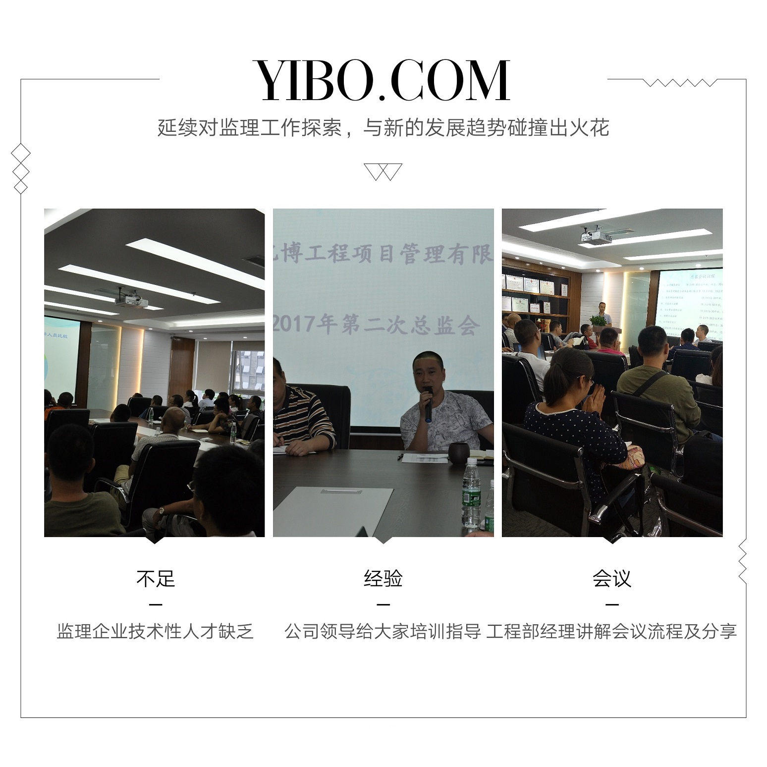 2017年9月2日,公司在总部召开了为期2天的“项目总监及项目负责人技术交流专题会”,会议特邀专家对当前建筑市场的形势、发展趋势、监理行业现状及未来发展进行了深入透彻的分析与讲解,提醒我们所有监理人必须要认清形势、要有时代紧迫感和忧患意识。总工办也围绕会议主题组织开展了“建筑安全事故案例分析、专题论文探讨、监理工作经验交流、监理工作缺陷分析和优秀范例品鉴”等相关会议事项,并就下一步监理工作质量、监理工作信息化管理、监理企业信用评价管理和工程全过程咨询工作等方面做出了详细部署与安排。