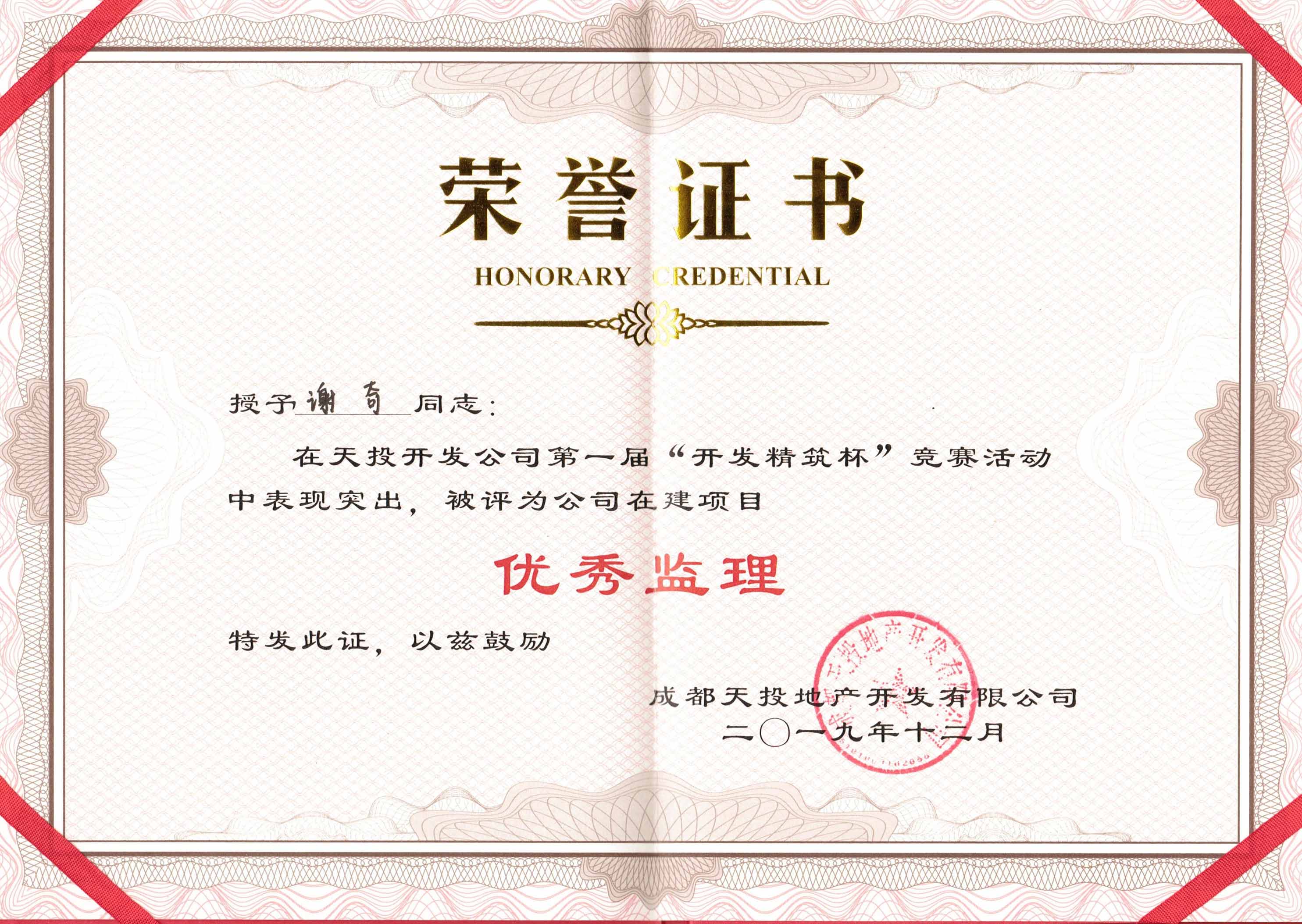 2020年4月3日上午9点30分,在成都天投集团麓城开发有限公司召开的“2019年质量安全总结大会暨天投开发第一届‘开发精筑杯’表彰大会”中,中鸿亿博集团万安人才公寓项目监理部荣获第一届“开发精筑杯”监理单位综合评比第一名,谢奇同志荣获在建项目“优秀监理” 的荣誉称号。