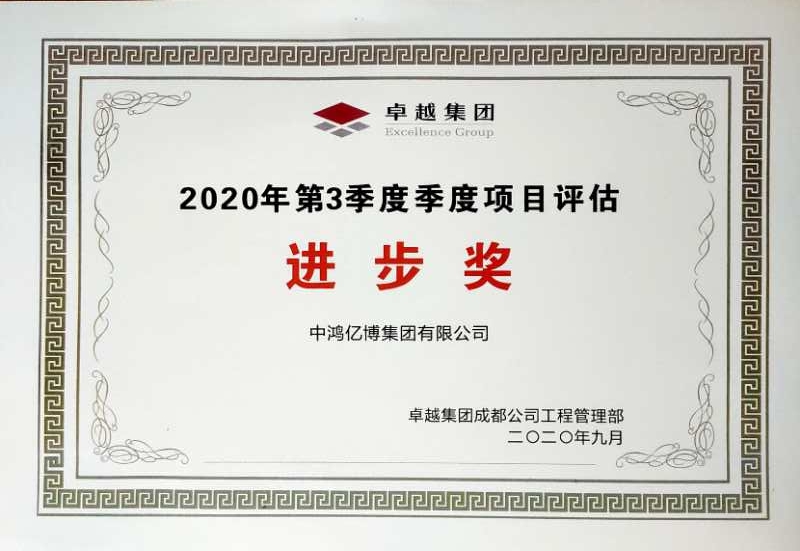 近日,由中鸿亿博集团有限公司监理的成华区水碾河14亩住宅及配套设施、社区用房、文化活动中心项目在中国卓越嘉城置业有限公司全国监理企业项目2020年第三季度评估检查中成绩优异荣获“进步奖”。