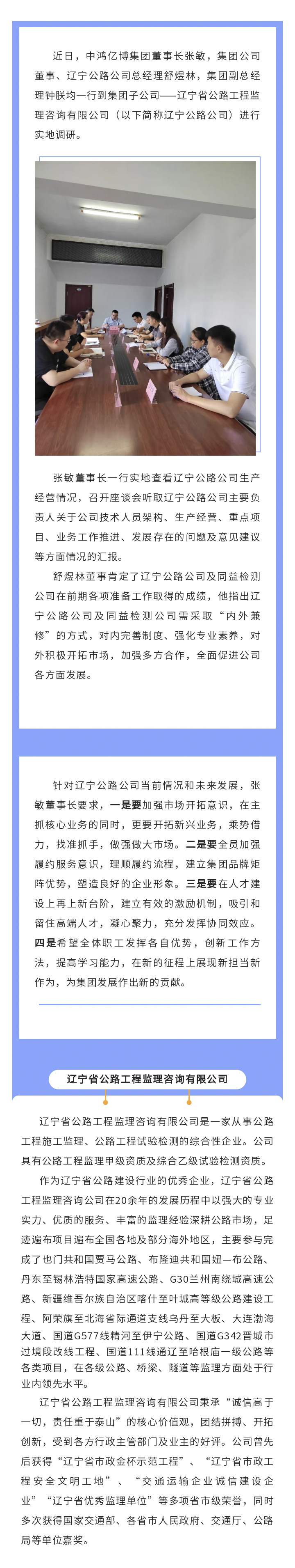 中鸿亿博集团董事长张敏一行到子公司——辽宁省公路工程监理公司调研