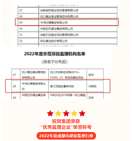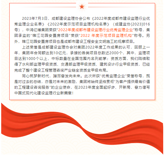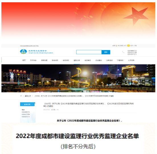 喜报!祝贺集团荣获“2022年度成都市建设监理行业优秀监理企业”称号