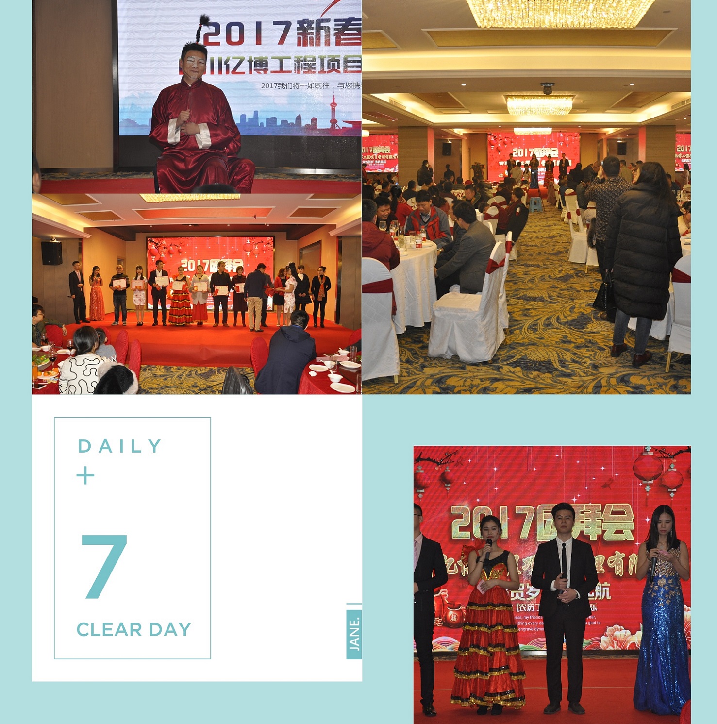 在会议开始和结束时段由公司董事长、执行董事致新春贺词,总结我公司在2016年取得的优异成绩,并制定2017年的奋斗目标。公司领导及各部门负责人为优秀员工、先进个人、优秀集体等表现突出员工颁发荣誉证书及奖金。
