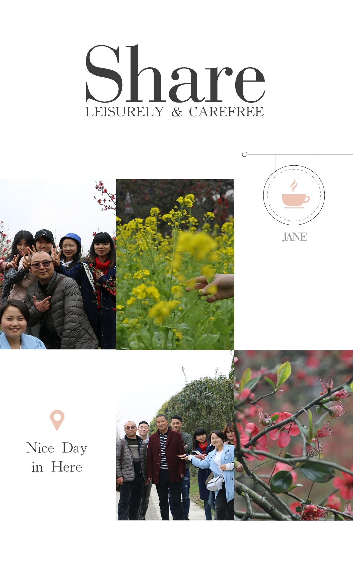 3.8节公司为了对全体女员工表达节日的祝福,体现公司的关怀,在当天,特组织公司全体员工到都江堰海棠公园集体活动一天。在3.8当天公司男同事全程为女同胞服务,吃饭、喝茶、赏花、照相等都由男同胞提供优质服务,让女同胞在当天感受女王般的礼遇。祝福女同胞天天开心快乐,也让公司男同事们体会到女同胞的辛苦和伟大。