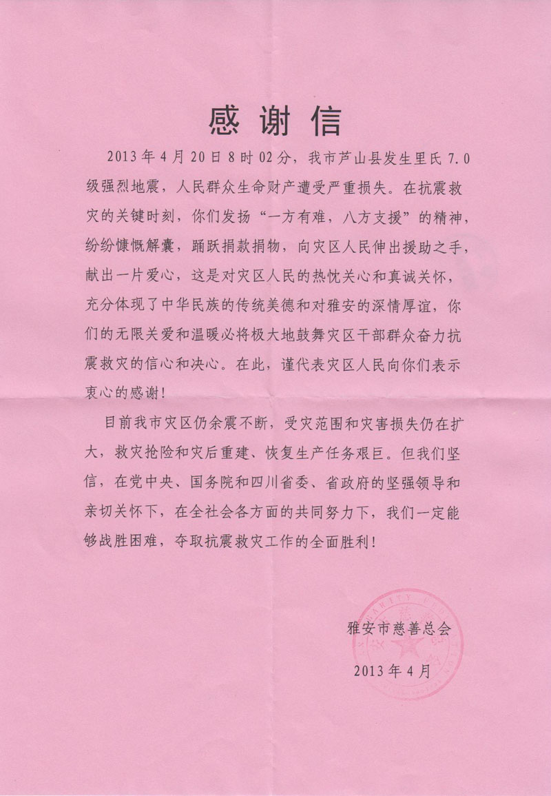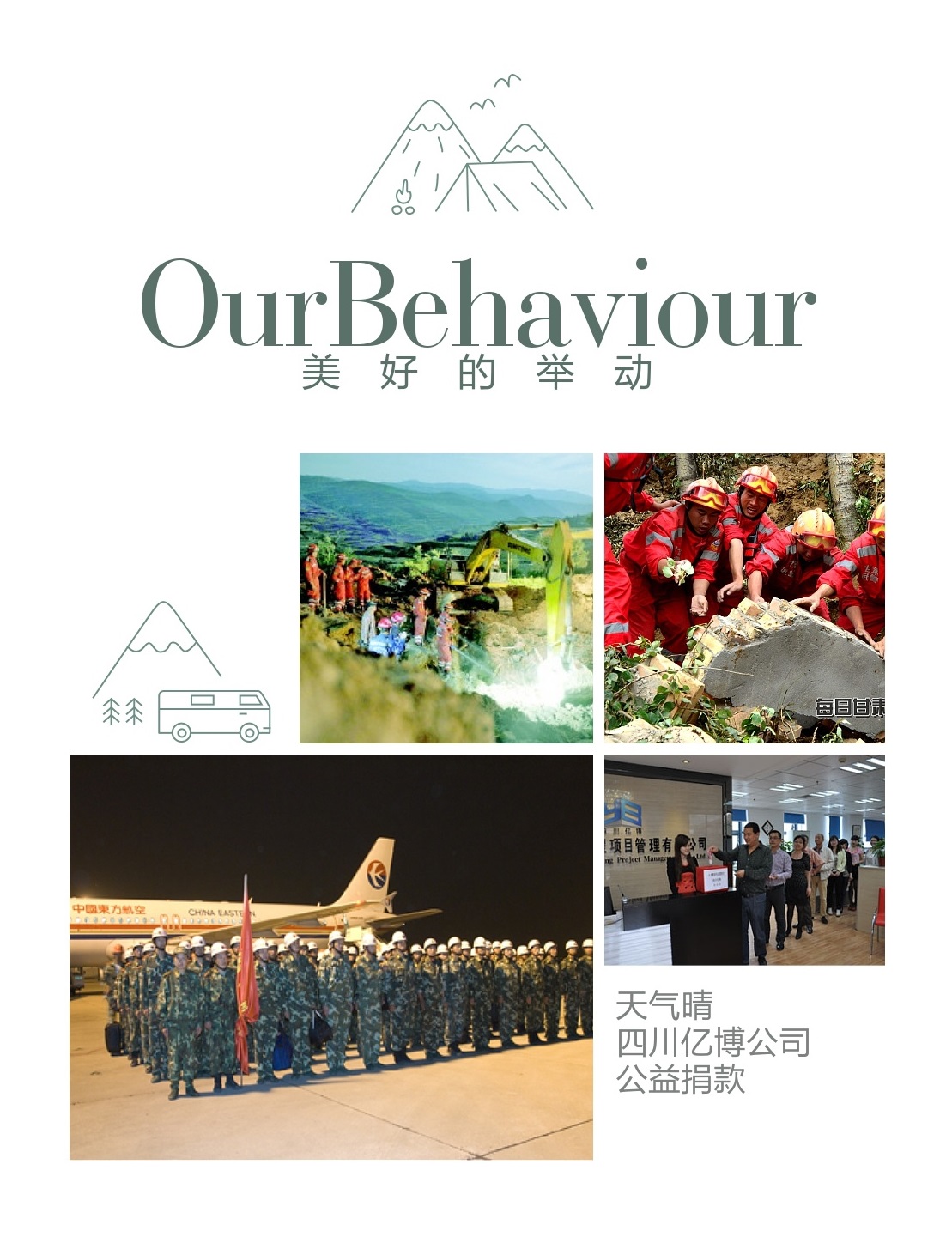 面对数百名同胞的逝去,上万名同胞的受伤,作为远离血泪之地的我们,虽然不能亲临现场解救每个微弱的生命,不能亲临现场缓解每位伤员的疼痛,但四川亿博公司于震后2017年5月5日为芦山地震捐款。通过我们力所能及的实际行动,发扬“人道、博爱、奉献”的精神,伸出热情的双手向灾区同胞奉献自己爱的力量,帮助灾区人民渡过难关,战胜灾害,早日恢复生产,重建美好家园。